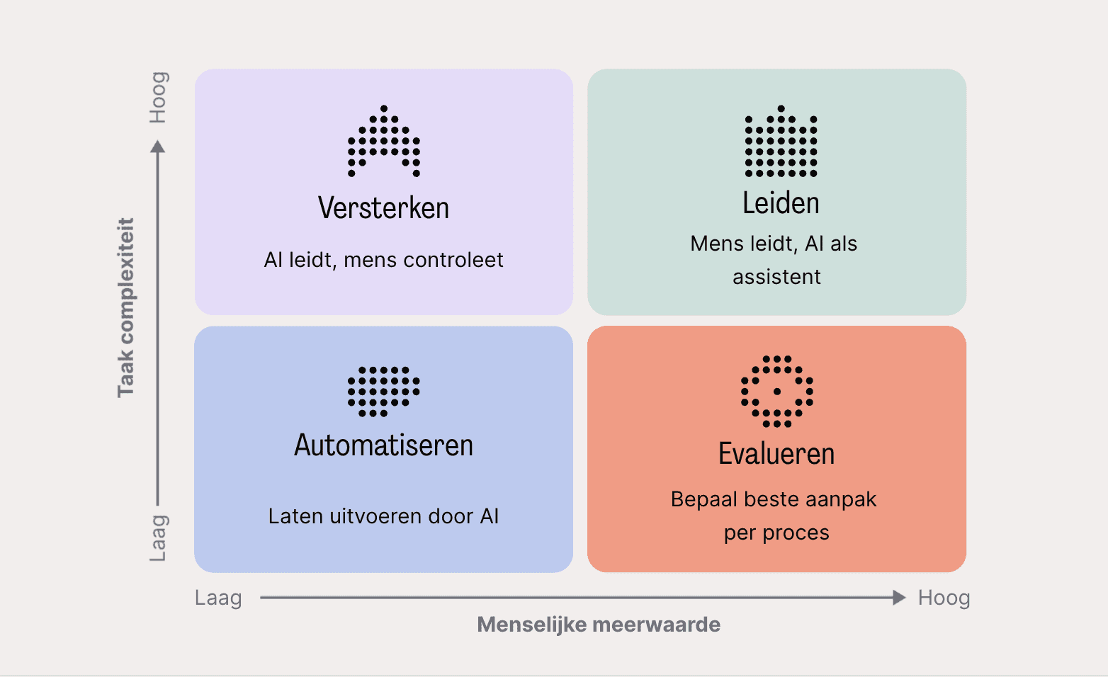 We gebruiken een simpel model om te bepalen waar AI past in een organisatie. Twee assen: taakcomplexiteit en menselijke meerwaarde.